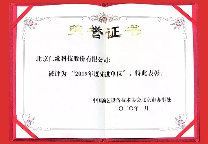 中國演藝設(shè)備技術(shù)協(xié)會北京辦事處授予北京仁歌科技股份有限公司“2019年度先進單位”并頒發(fā)授牌及證書