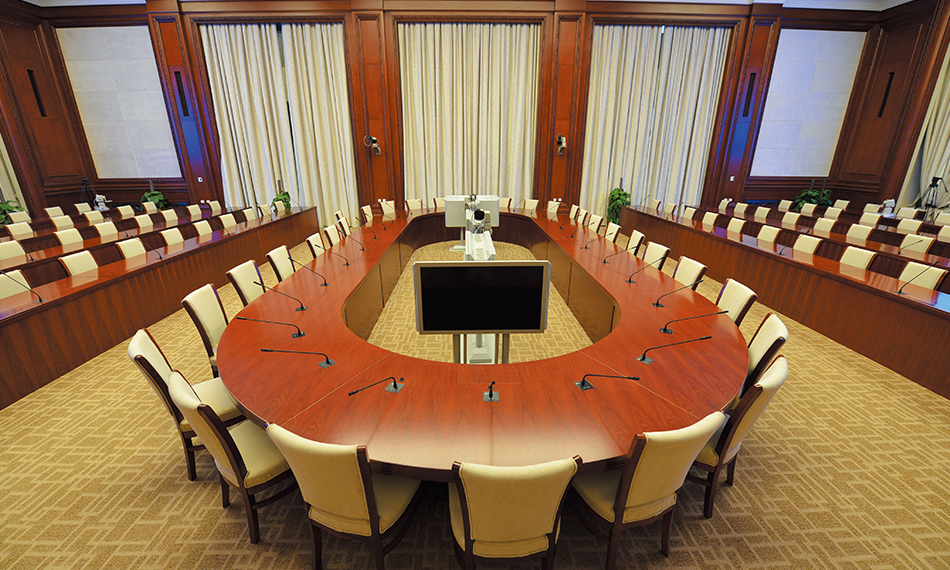 仁歌承接了數(shù)字會議系統(tǒng)的建設(shè)。包括3間大型會議室、5間中型會議室、12間小型會議室。會議室具備音視頻信號演示、會標(biāo)顯示、3D+4K電影放映、同聲傳譯等功能。系統(tǒng)設(shè)計上,采用音頻系統(tǒng)雙備份的方式,在輸入輸出接口機、音頻矩陣、音頻網(wǎng)絡(luò)、功率放大器四方面互為備份;視頻方面,采用了廣播級高清攝像機,可以采集具有高清晰度的視頻圖像,采集的信號進行兩路同時傳遞,以保障系統(tǒng)穩(wěn)定、可靠、安全運行。此外,整個系統(tǒng)采用集中控制,在總控制室可以分別控制和調(diào)度各會議室的音視頻信號和各會議室燈光系統(tǒng),各會議室集中控制系統(tǒng)組網(wǎng)連接,方便操作人員使用。